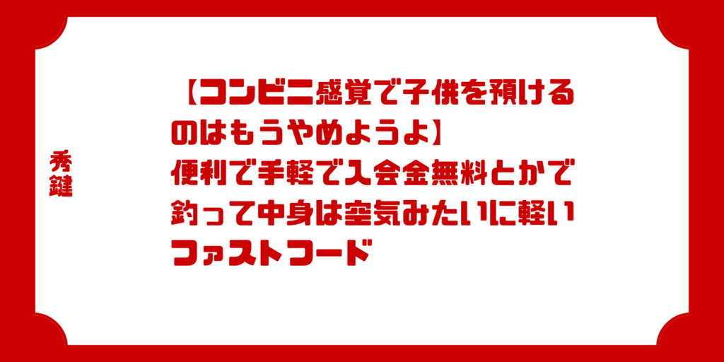 3. 【コンビニ感覚で子供を預けるのはもうやめようよ】 便利で手軽で入会金無料とかで釣って中身は空気みたいに軽いファストフード