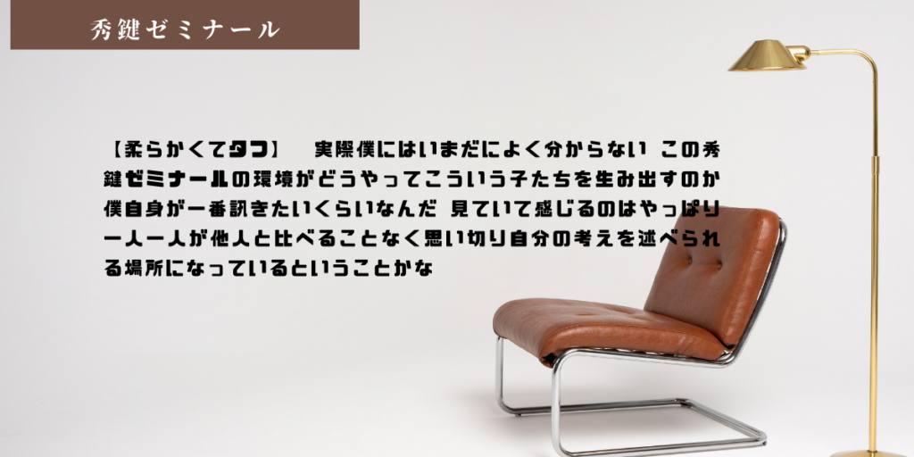【柔らかくてタフ】 実際僕にはいまだによく分からない この秀鍵ゼミナールの環境がどうやってこういう子たちを生み出すのか僕自身が一番訊きたいくらいなんだ 見ていて感じるのはやっぱり一人一人が他人と比べることなく思い切り自分の考えを述べられる場所になっているということかな