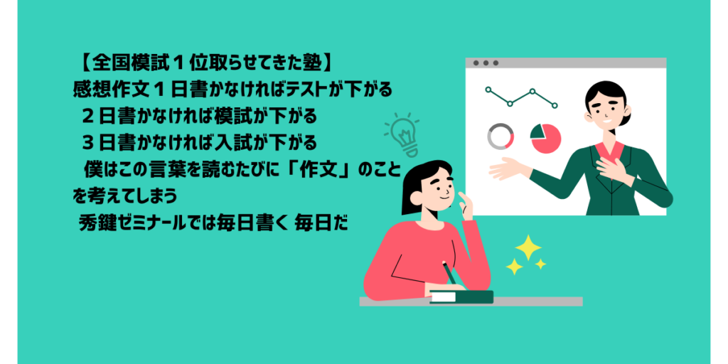 【全国模試1位取らせてきた塾】感想作文1日書かなければテストが下がる 2日書かなければ模試が下がる 3日書かなければ入試が下がる 僕はこの言葉を読むたびに「作文」のことを考えてしまう 秀鍵ゼミナールでは毎日書く 毎日だ